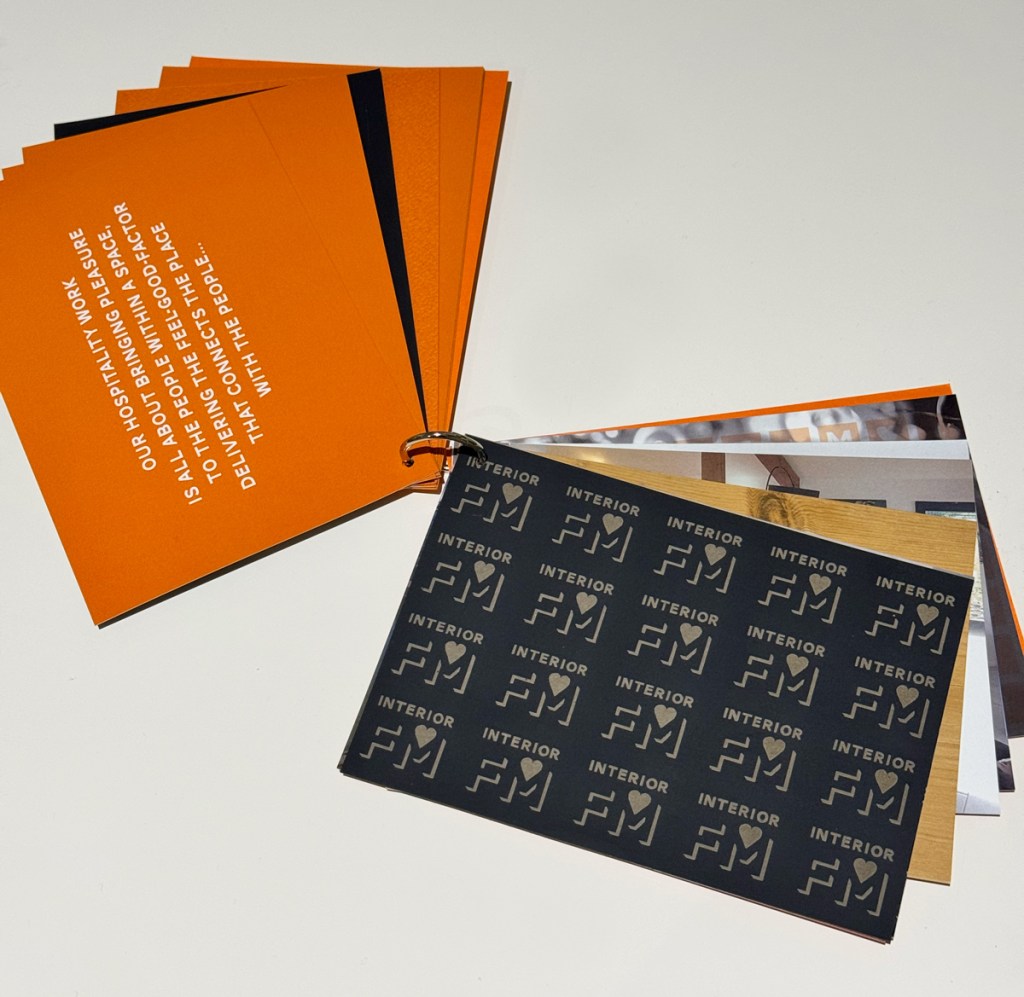 Having teased people with what Interior FM was and what it would bring, the design director gave a short presentation about the new brand. We kept this really simple, a couple of slides about the values and experience, alongside screen grabs from the new website (we’d also delivered). The pivotal moment came as the director finished his presentation and he, along with the rest of the Interior FM team asked who wanted a business card? That might sound strange, maybe even arrogant? But there was a very good reason for this. We had designed the cards to be another talking point, using the identity to shape the cards, creating something that was itself very memorable and expressed a great deal about what the business produced.